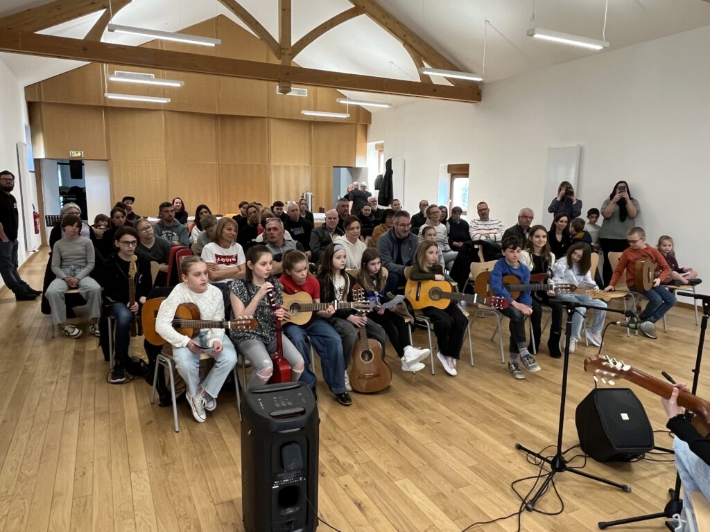 Ce concert s’est déroulé en présence de Monsieur le Maire, de Madame la Présidente de l’École de Musique, de l’enseignante de guitare, ainsi que de nombreux parents.
